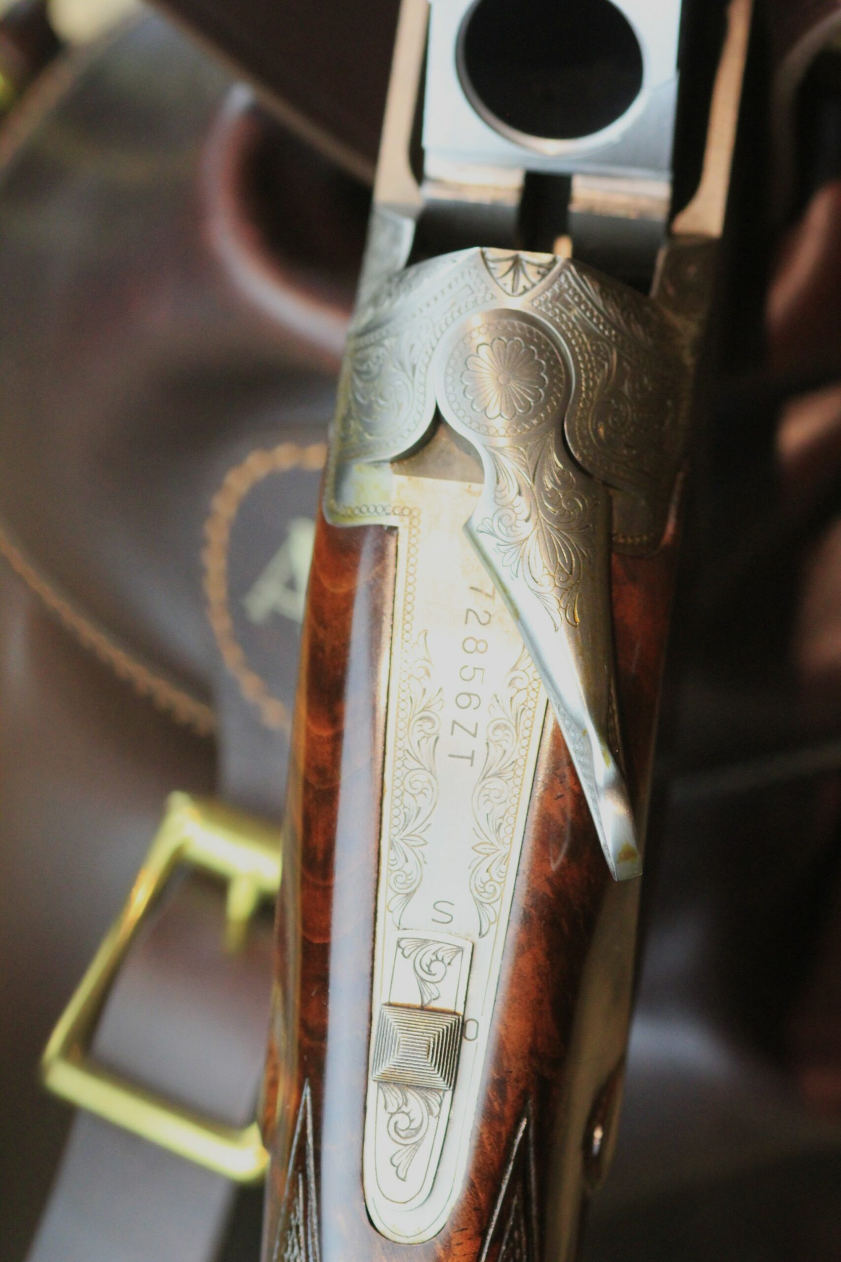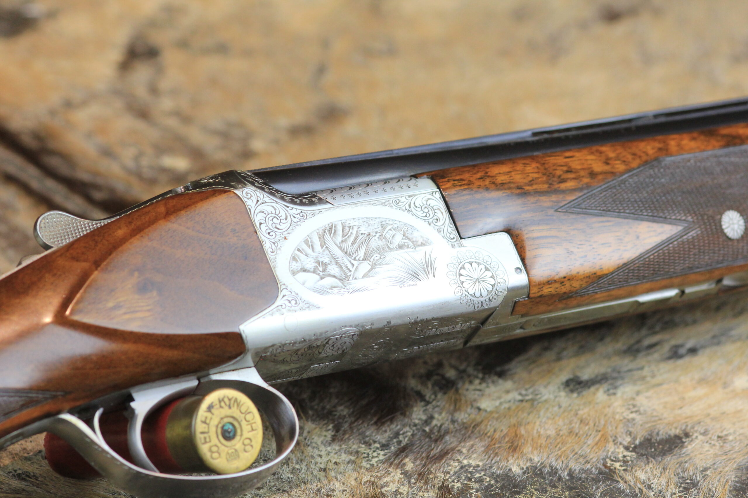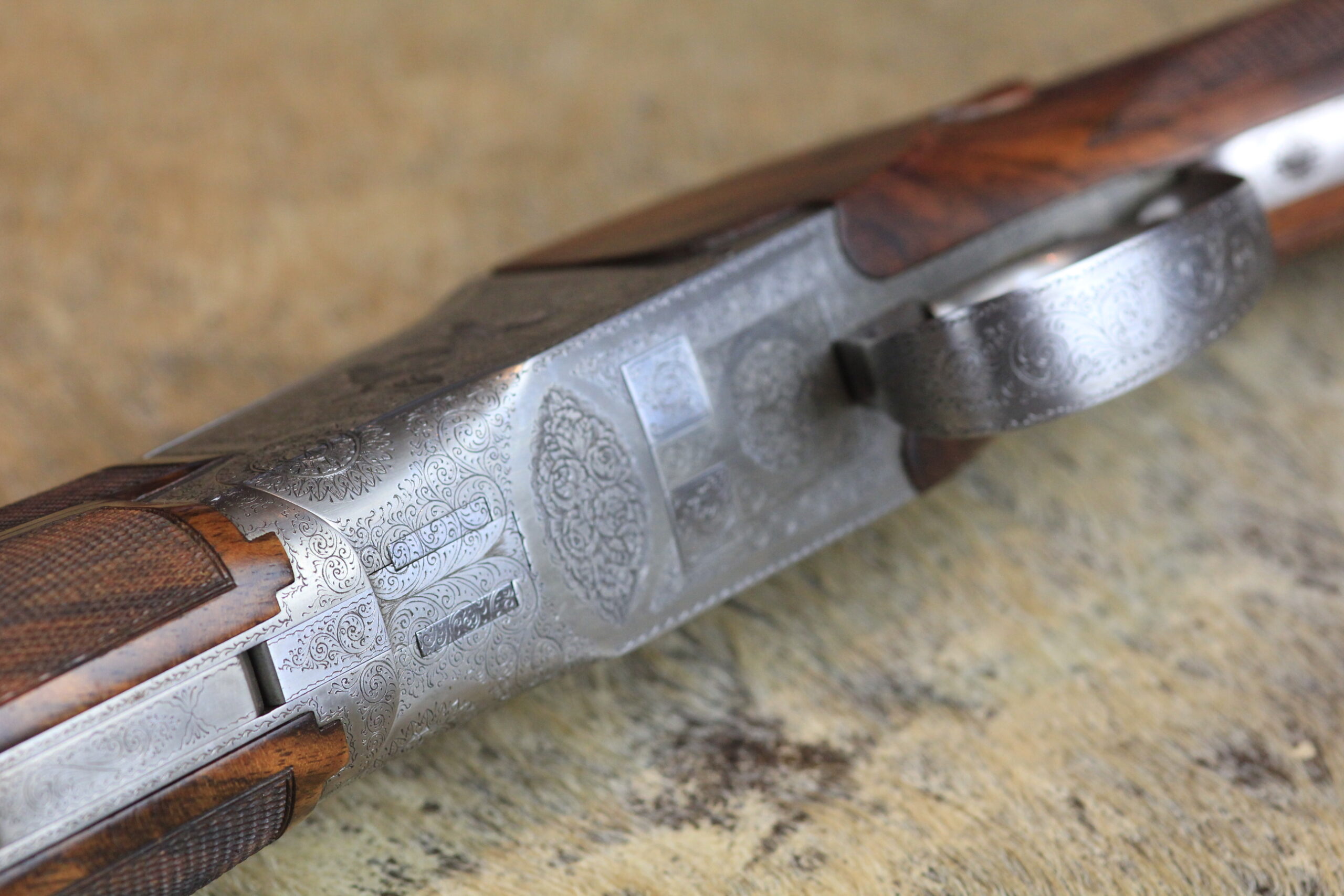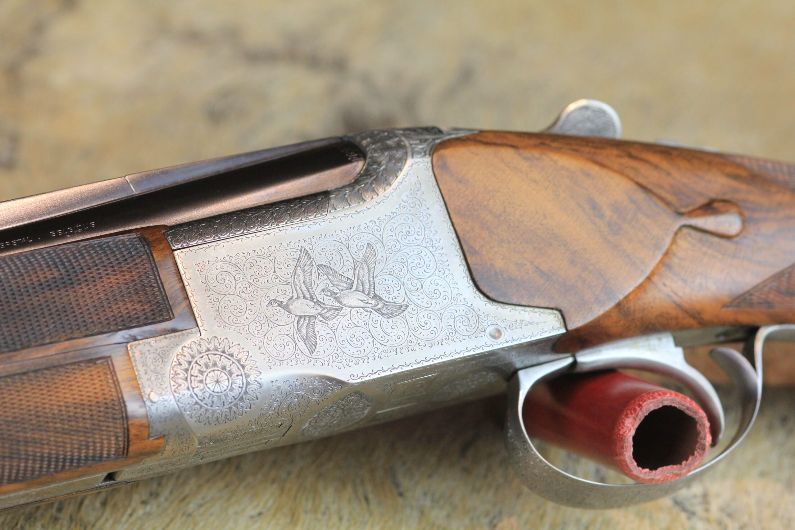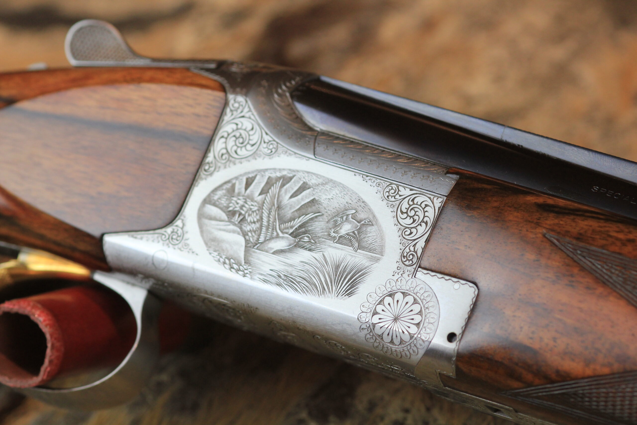 Besonderheiten: HK 8,mit einer Arabeskengravur und Flugwildjagdmotiv Fasanen,Rothühnern ( Bottega C. Giovanelli ) und Ejektoren,Umschaltung der Laufwahl auf dem Kolbenhals in der Sicherung, Waffe hat Steelproof und ist universel einsetzbar
