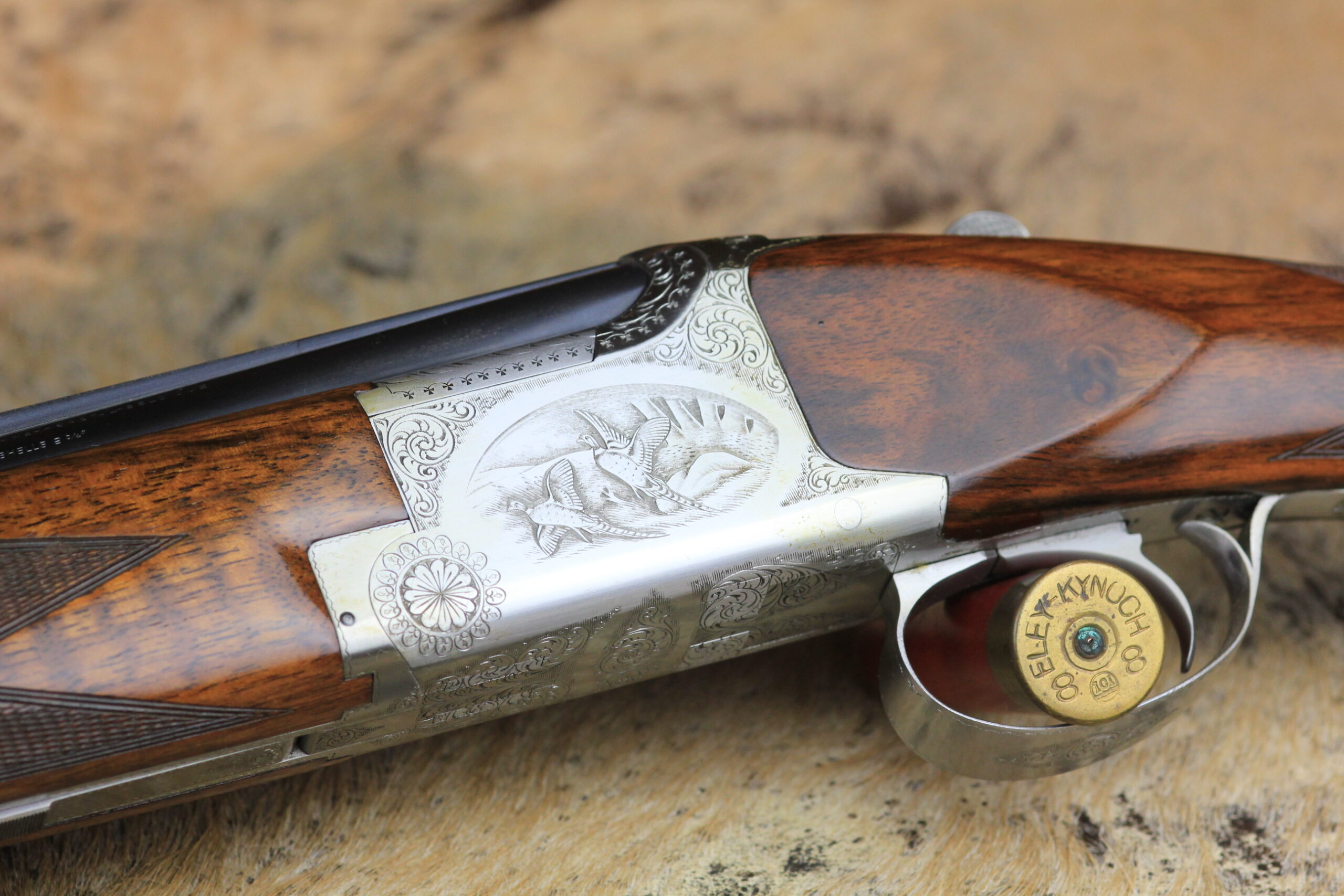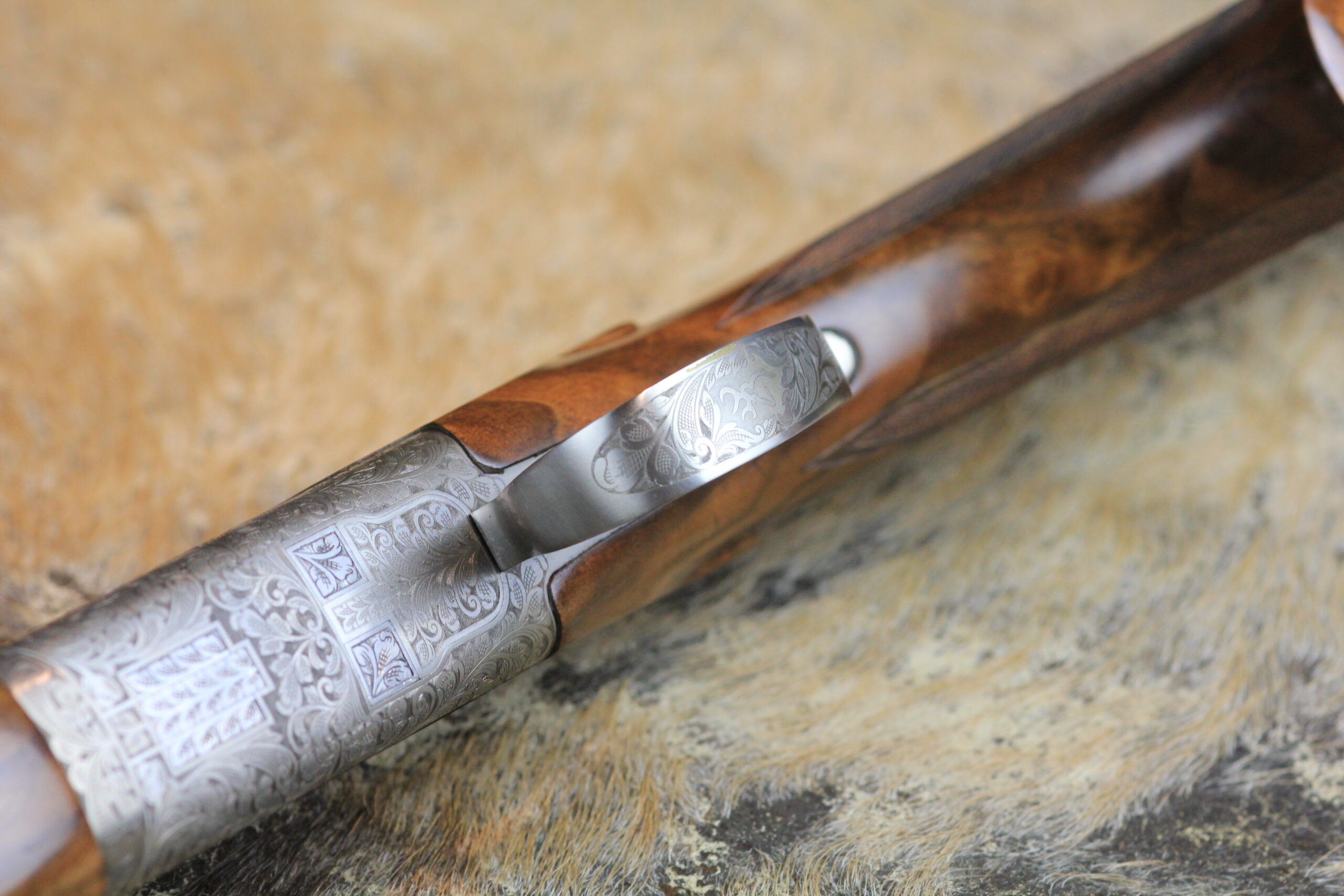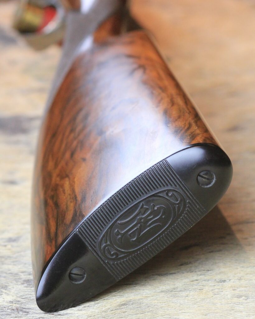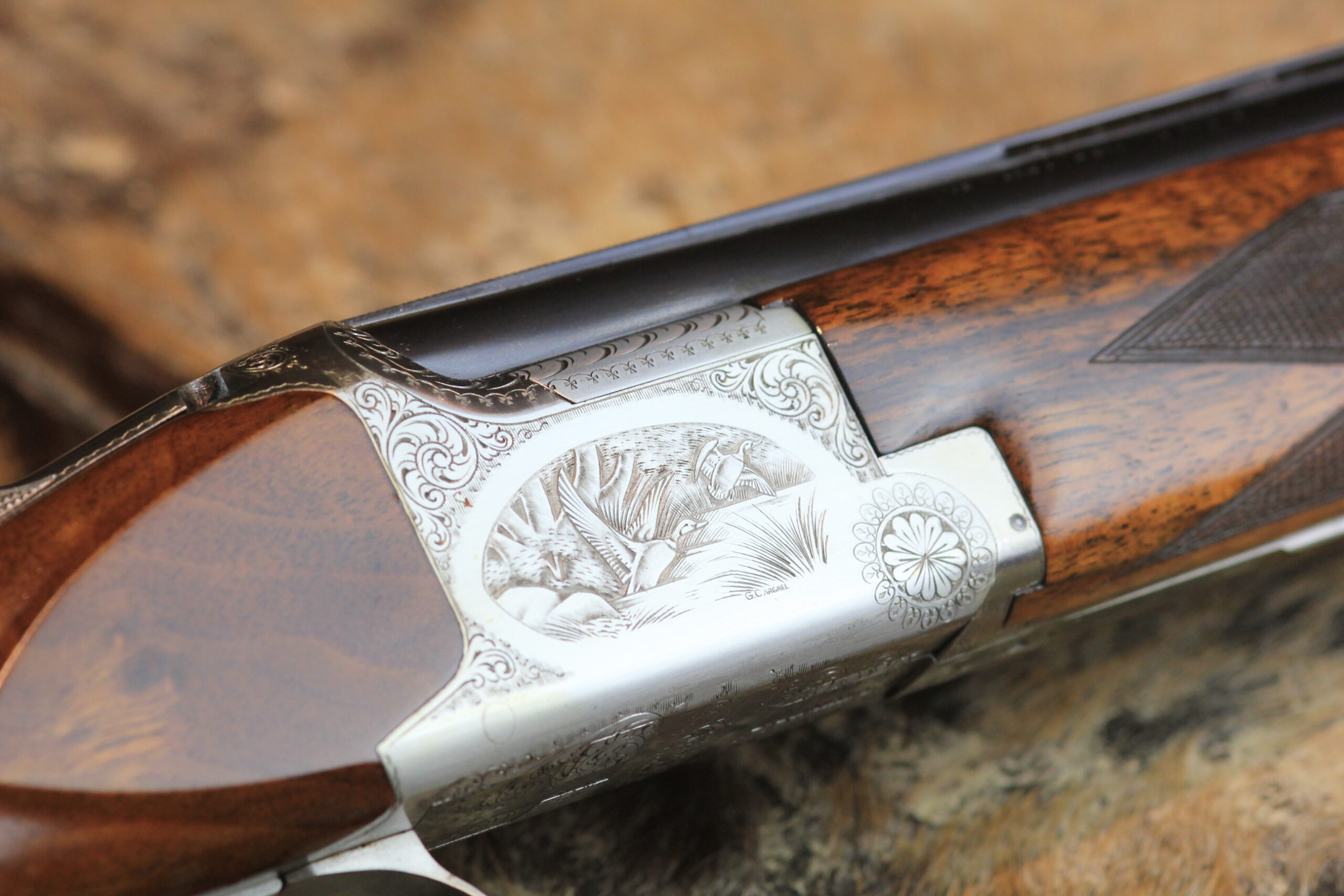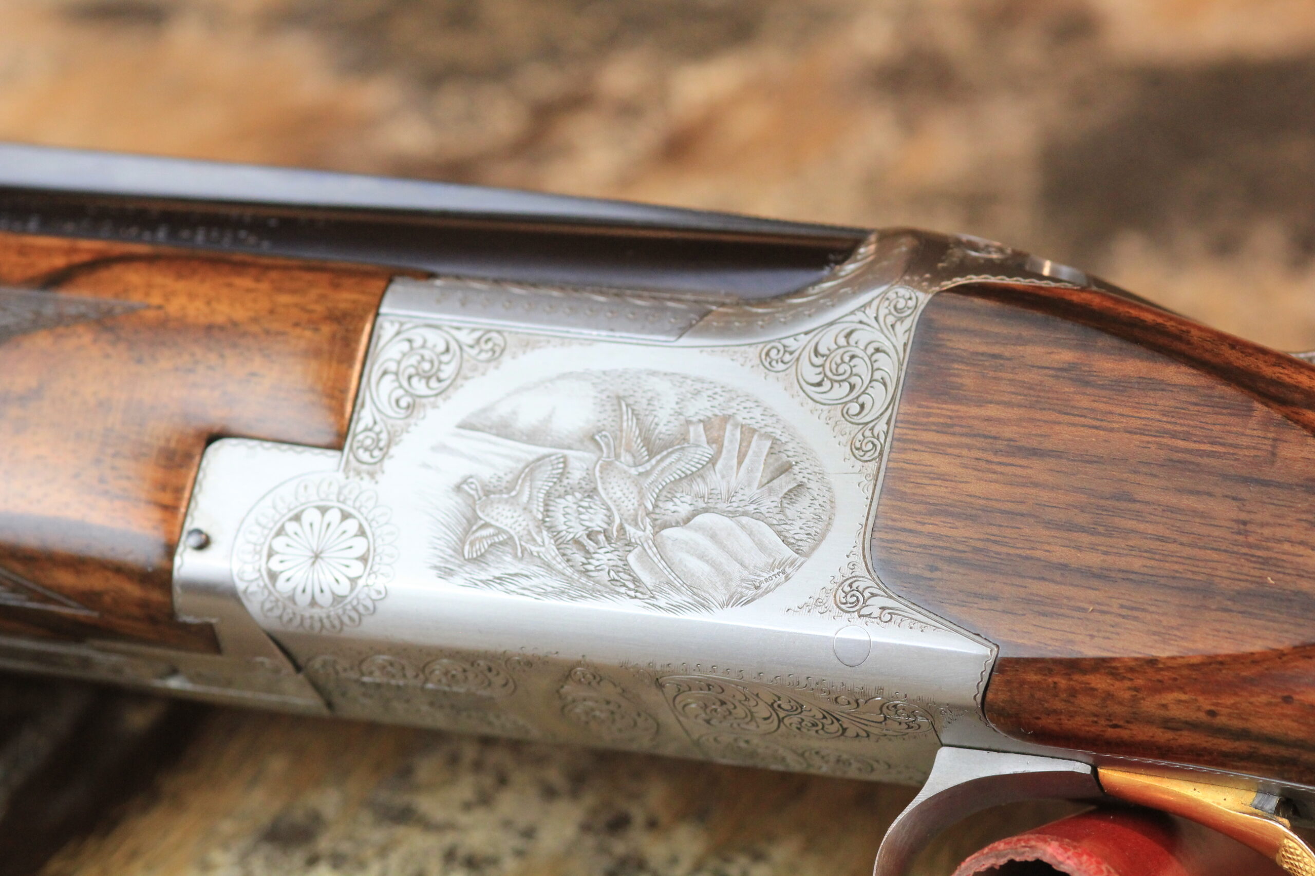 Besonderheiten: HK 8,mit einer Arabeskengravur und Flugwildjagdmotiv Fasanen,Rothühnern ( Bottega C. Giovanelli ) und Ejektoren,Umschaltung der Laufwahl auf dem Kolbenhals in der Sicherung, Waffe hat Steelproof und ist universel einsetzbar