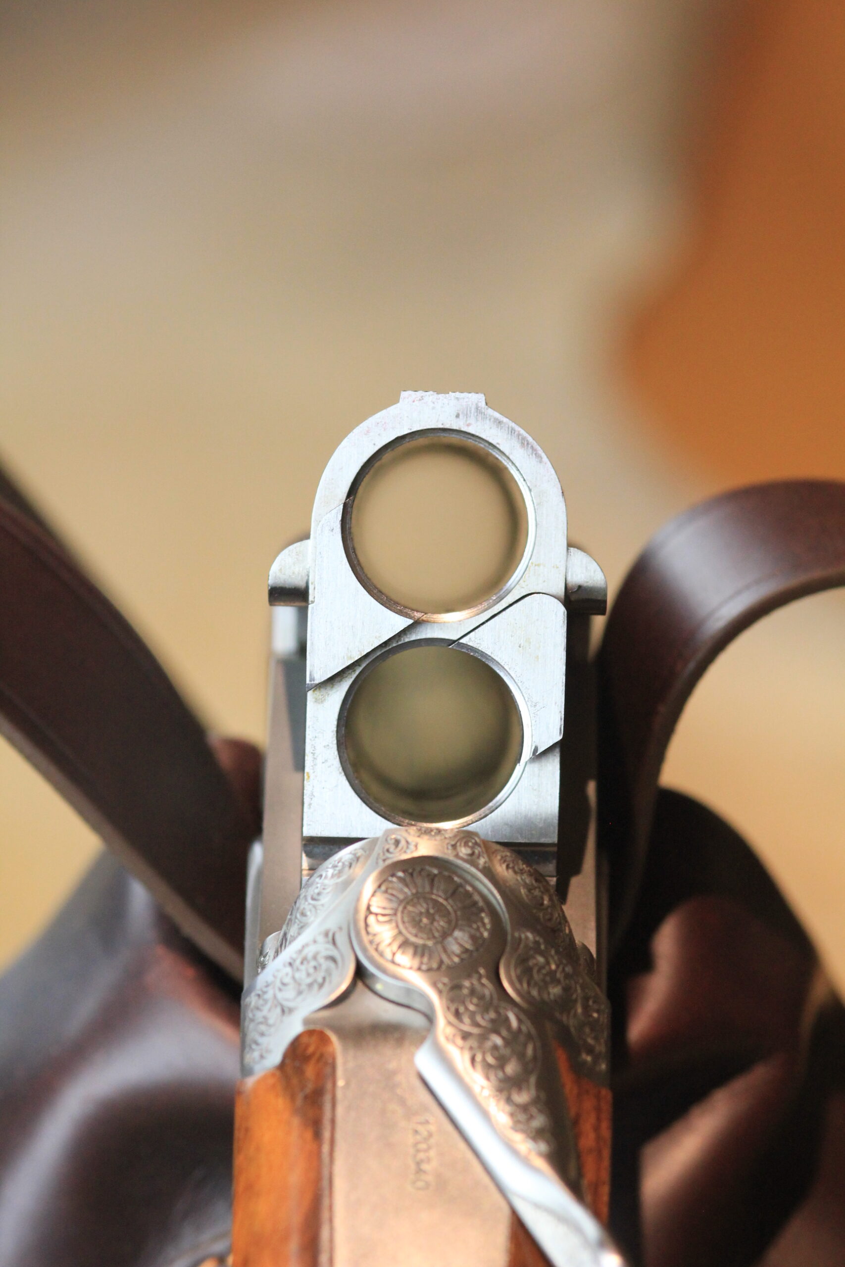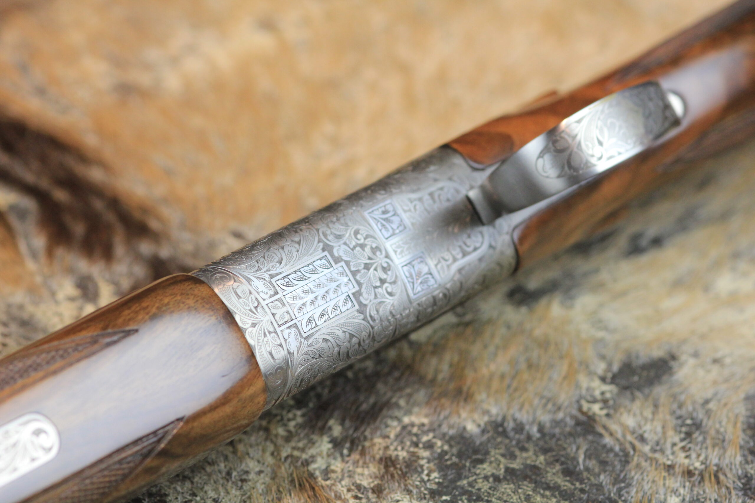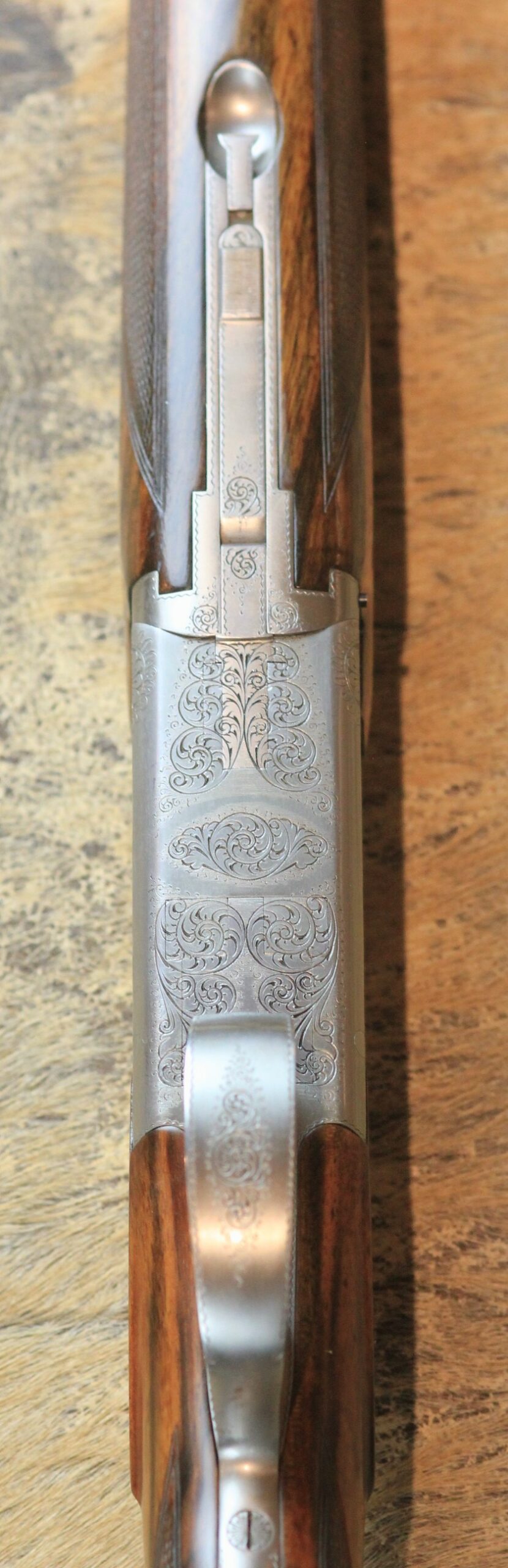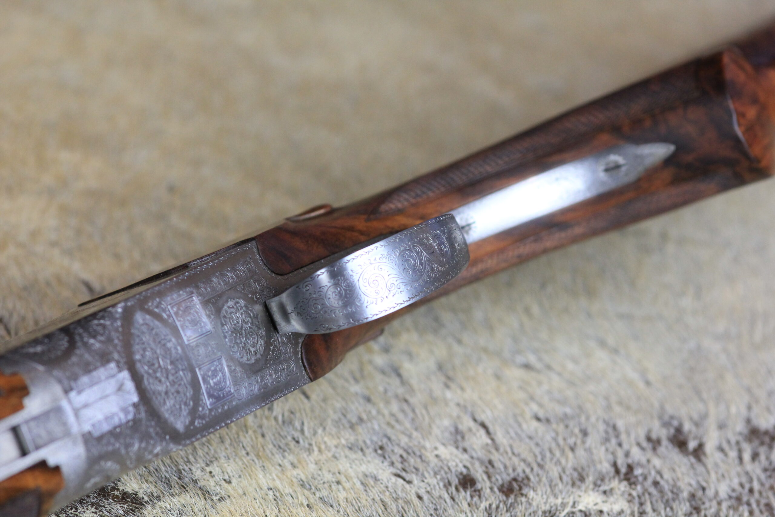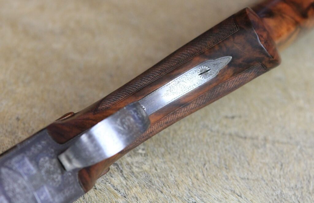 Besonderheiten: HK 8,mit einer Arabeskengravur und Flugwildjagdmotiv Fasanen,Rothühnern ( Bottega C. Giovanelli ) und Ejektoren,Umschaltung der Laufwahl auf dem Kolbenhals in der Sicherung, Waffe hat Steelproof und ist universel einsetzbar