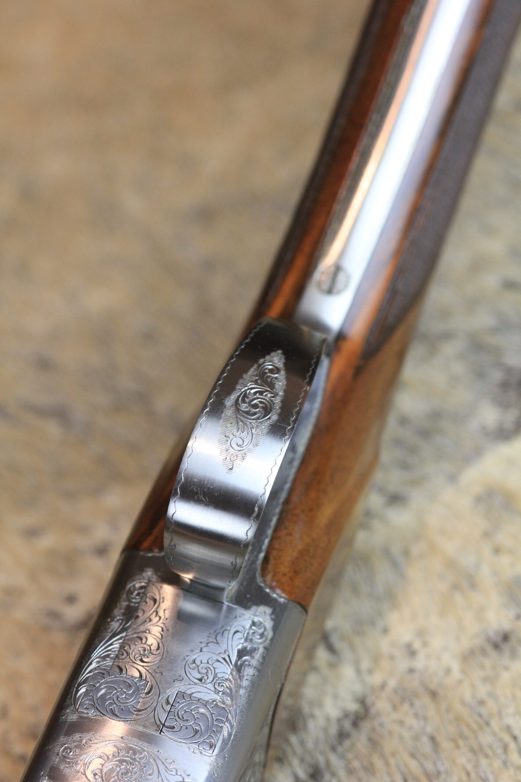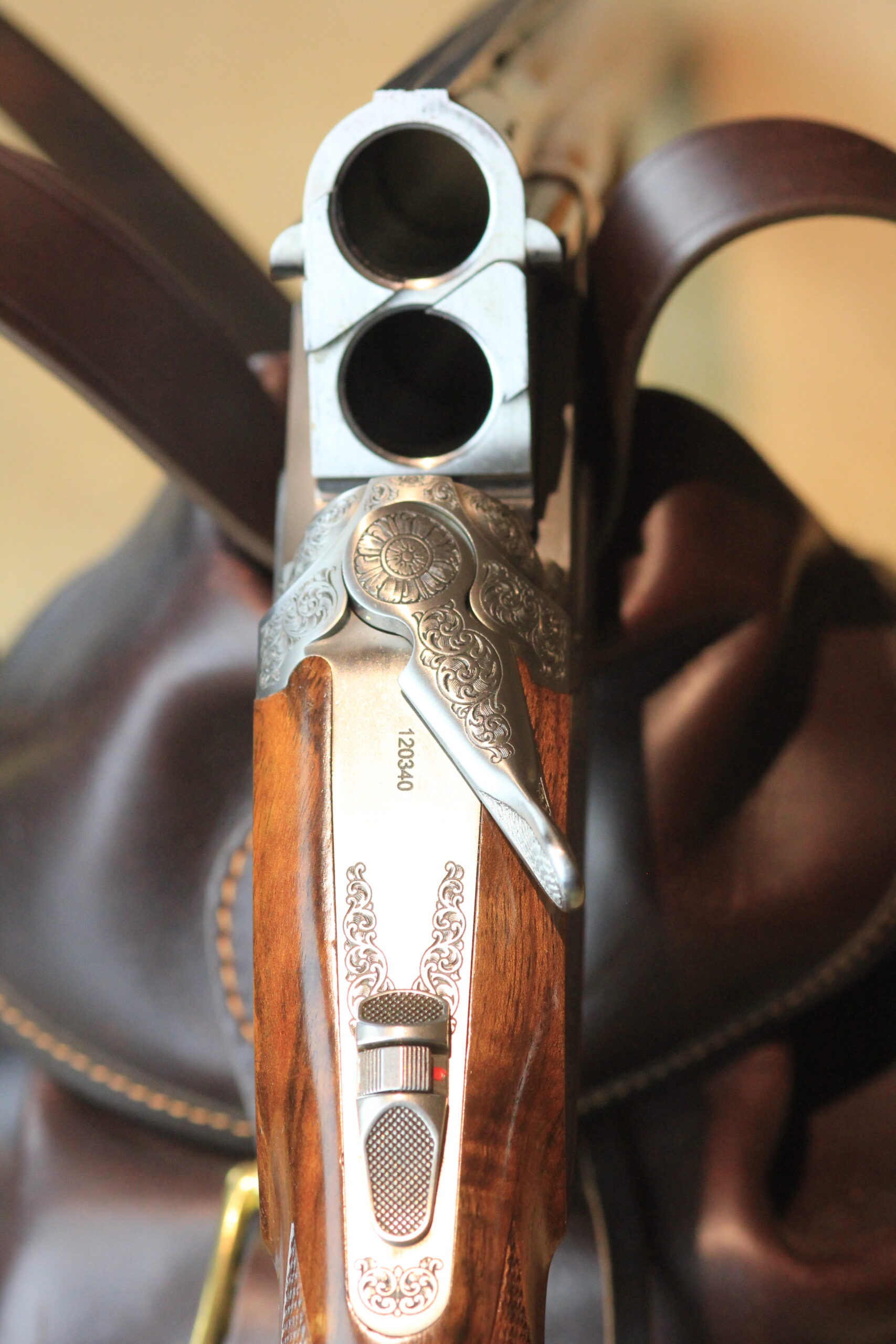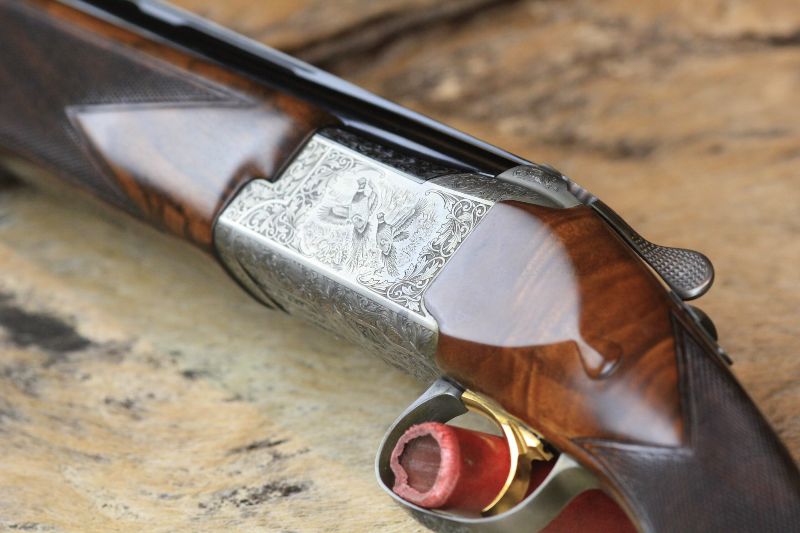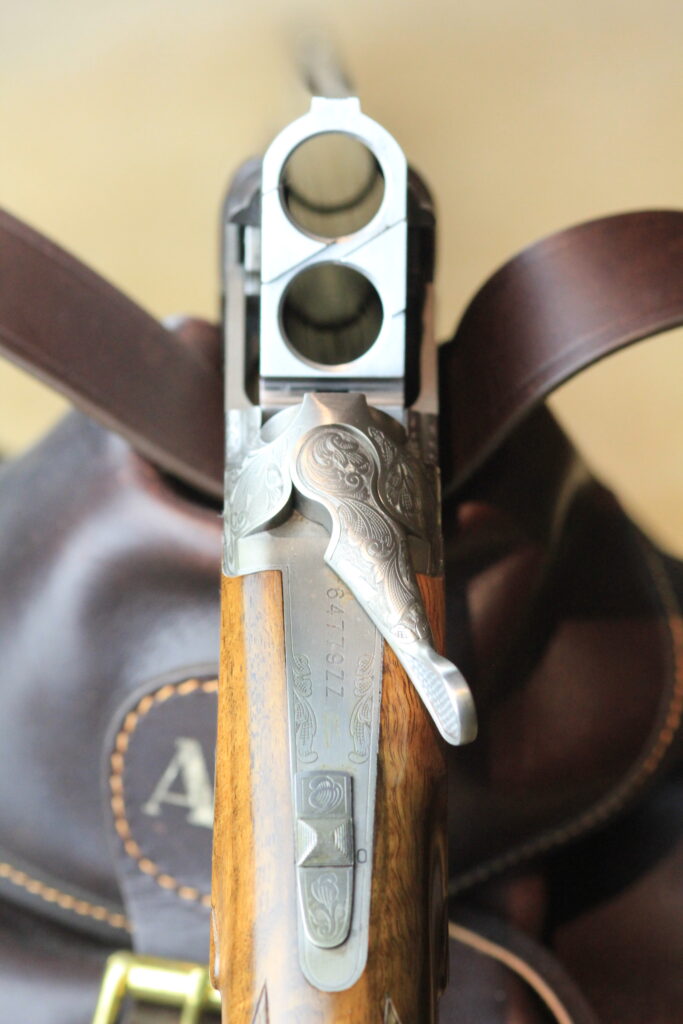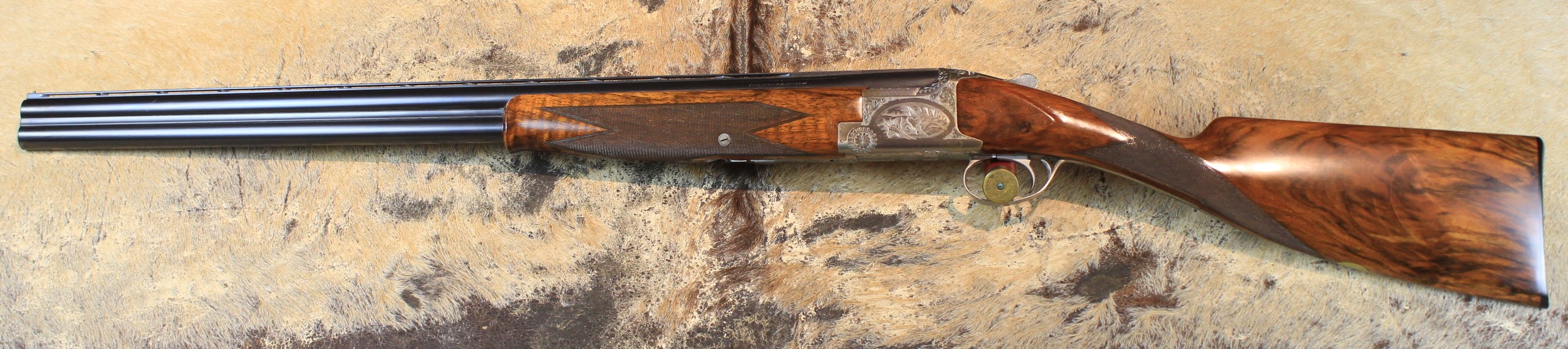 Besonderheiten: HK 8,mit einer Arabeskengravur und Flugwildjagdmotiv Fasanen,Rothühnern ( Bottega C. Giovanelli ) und Ejektoren,Umschaltung der Laufwahl auf dem Kolbenhals in der Sicherung, Waffe hat Steelproof und ist universel einsetzbar
