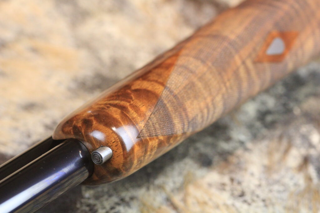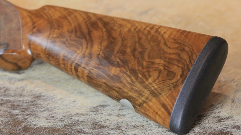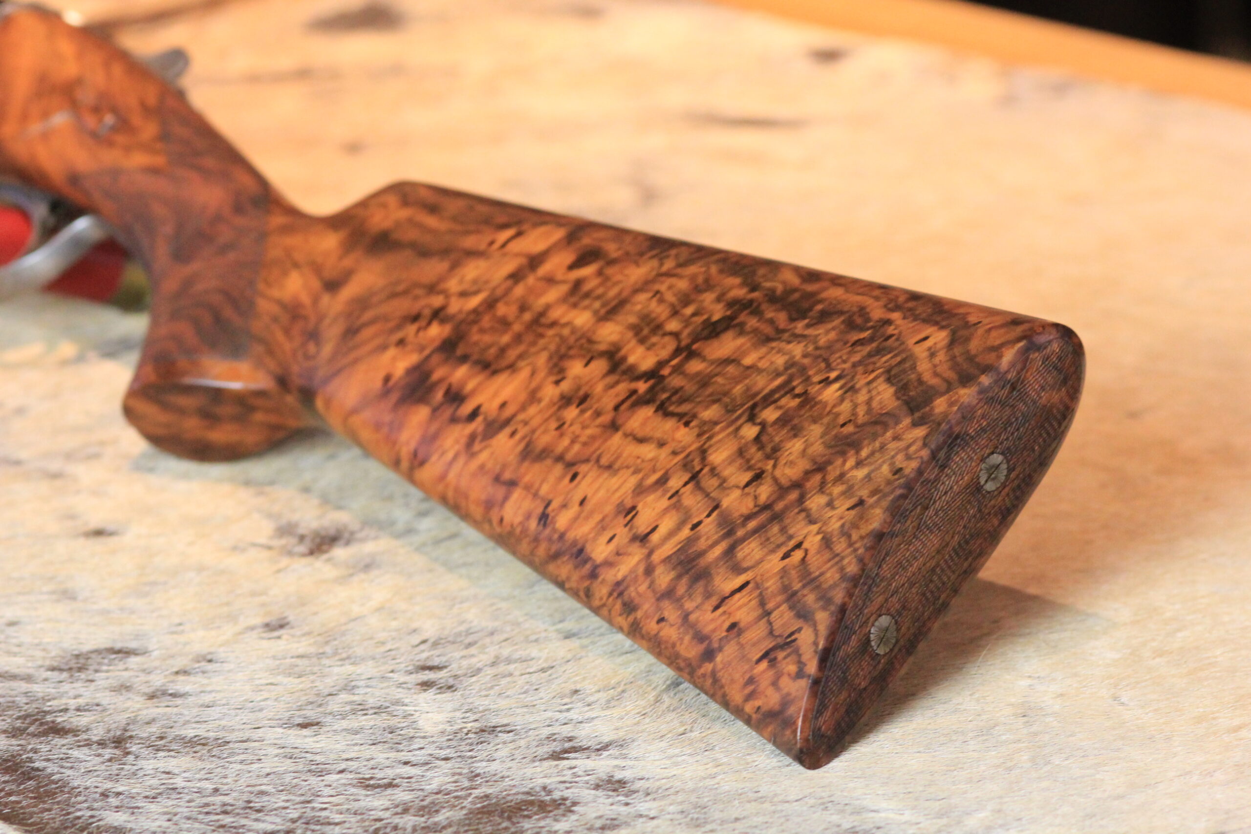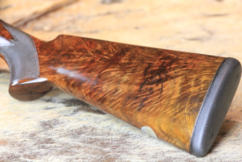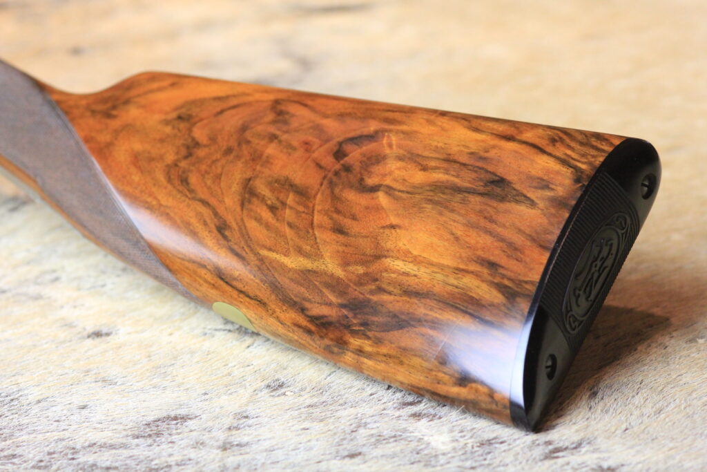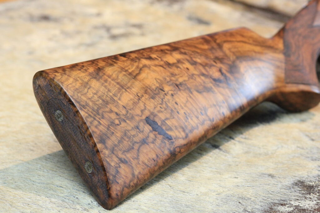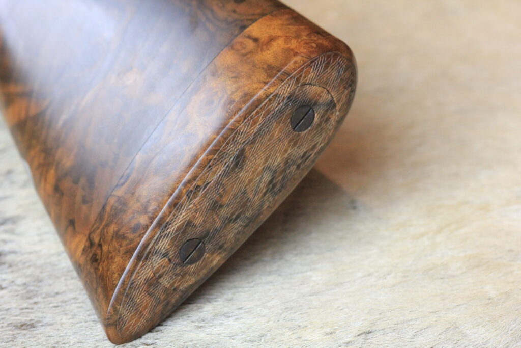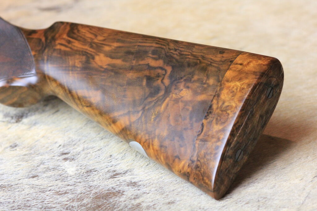 Schäftung: absolutes schönes Wurzelmaserholz mit eingelassenem Stocknagel und Träne an den Seitenbacken mit Holzverlängerung und Holzabschluss