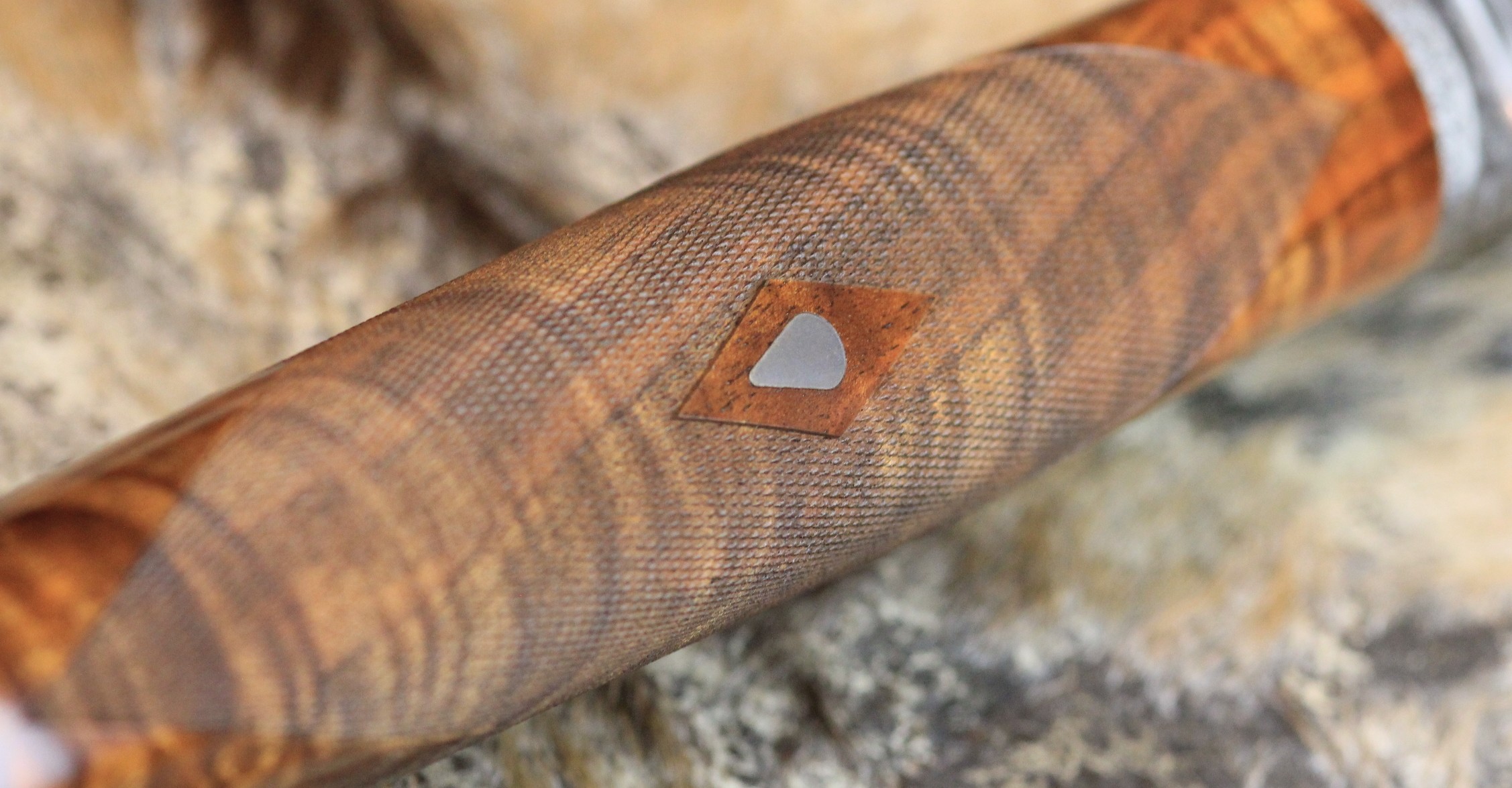 Schäftung: absolutes schönes Wurzelmaserholz mit eingelassenem Stocknagel und überzogene Lederkape