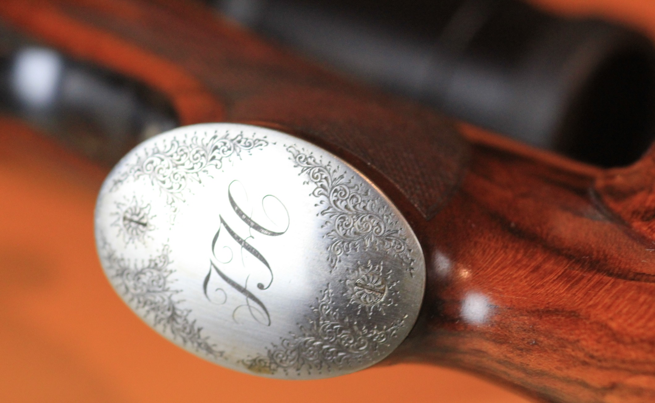Besonderheiten: vier Fuß Einhakmontage, offene Visierung, Scheibenverlängerung, Silbermonogrammplatte
