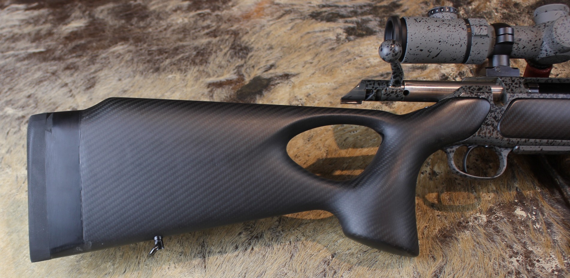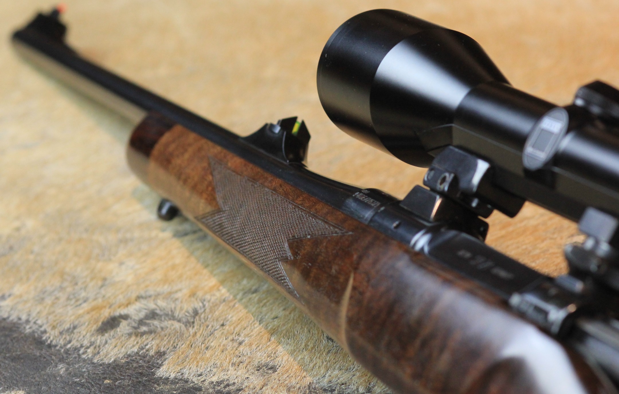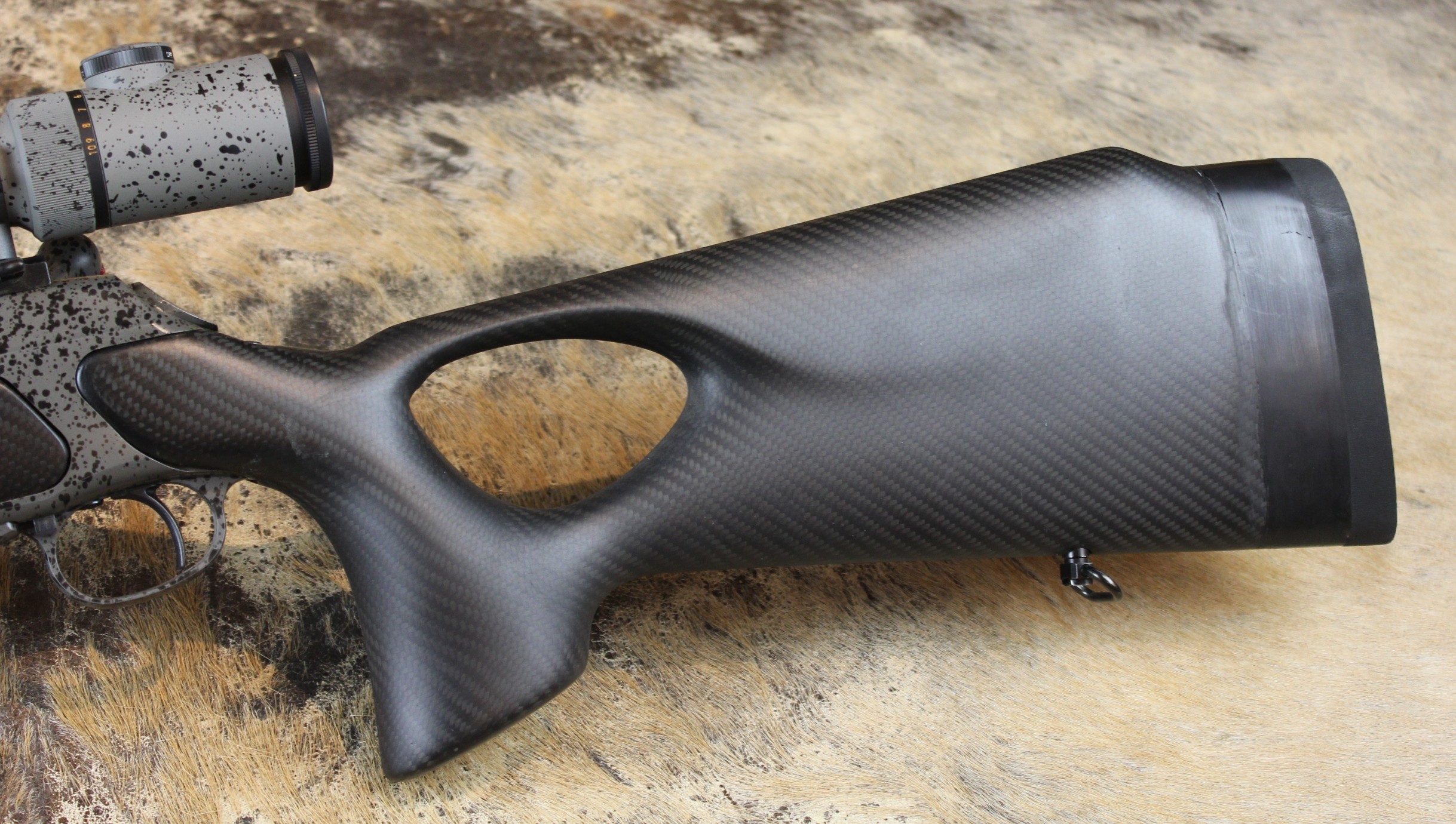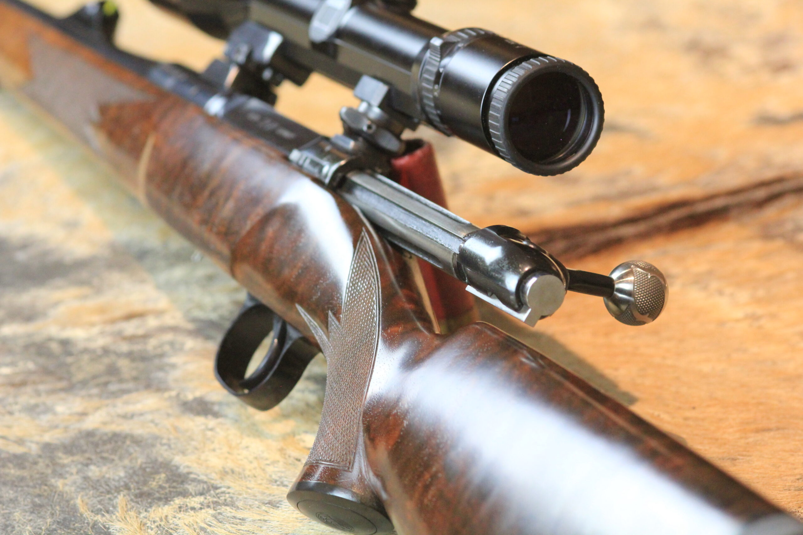 - Schaft: Nussbaumholz mit griffig geschnittener Fischhaut