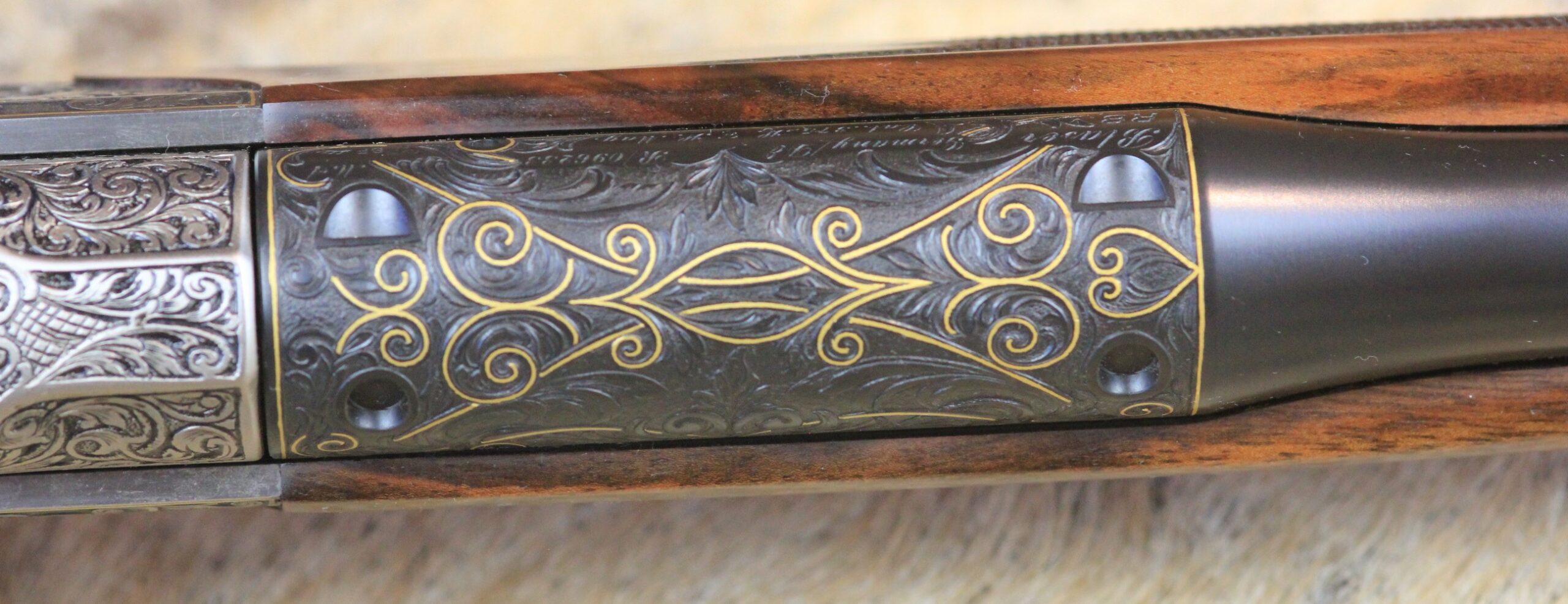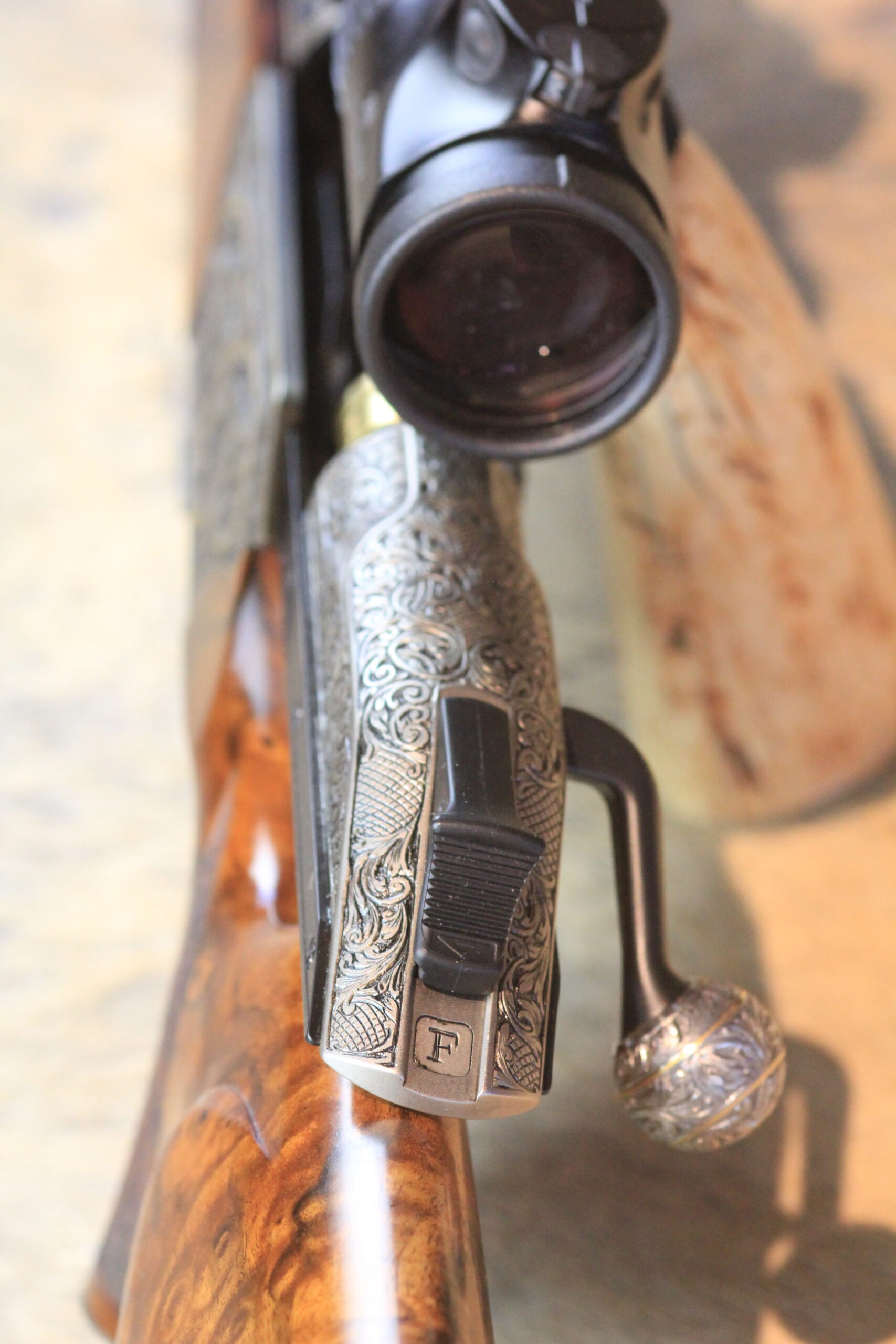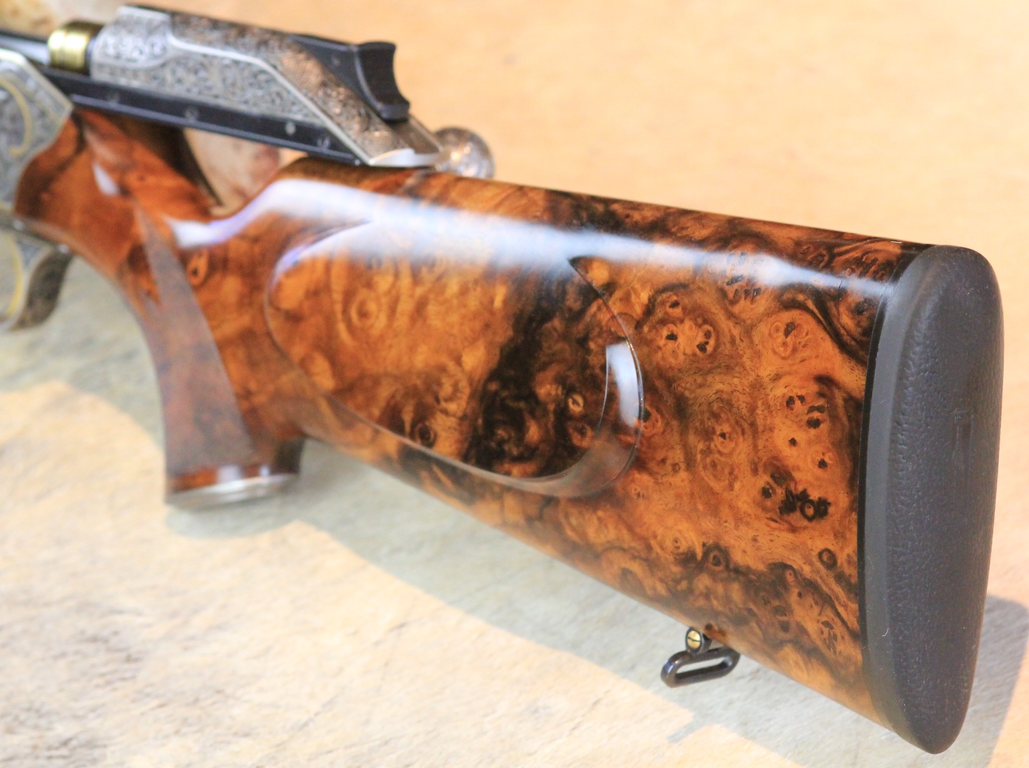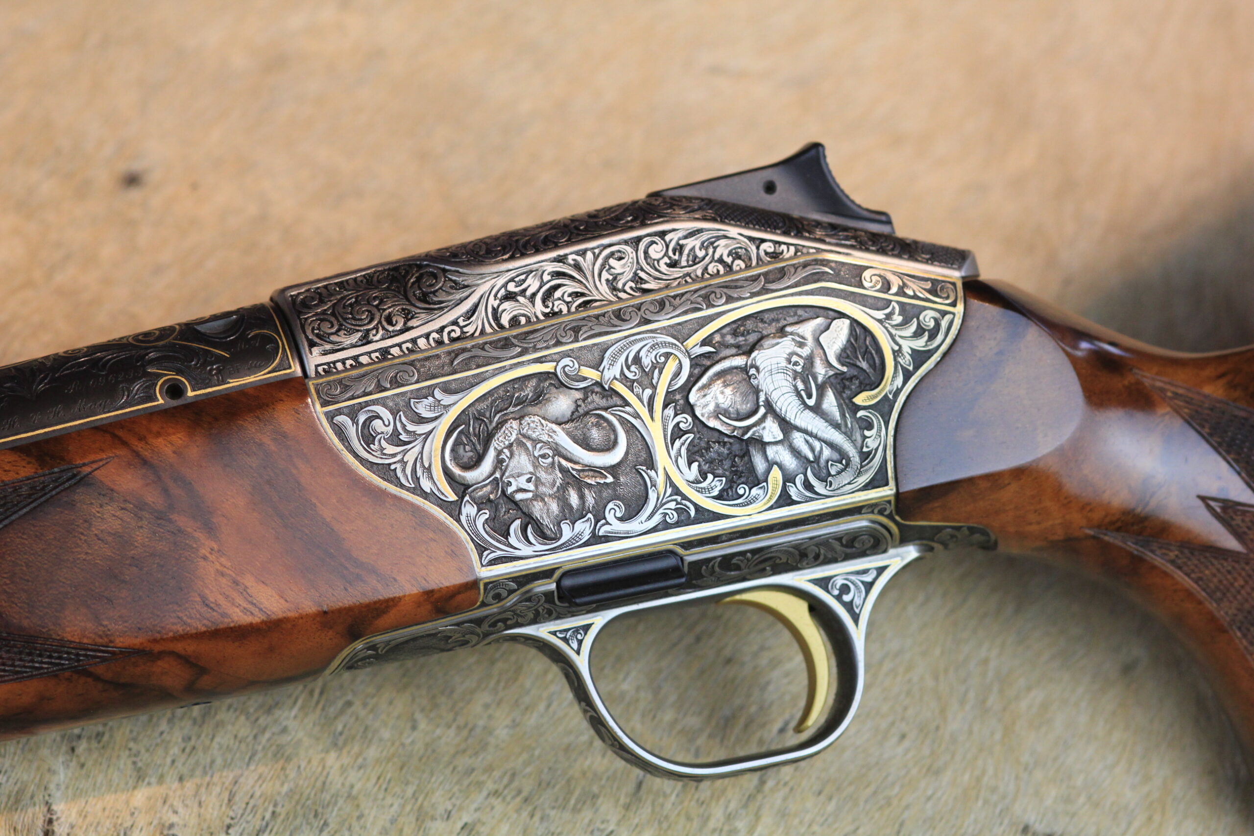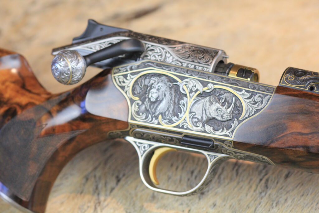 Besonderheiten: sensationelles türkisches Wurzelnussbaumholz der Kat: 10 mit tiefgestochener Gravur von Alexandra Feodorow “ BIG FIVE Gravur “ mit Goldeinlagen - Zubehör: PK Monogram mit eigener Gestaltung,Lederkoffer C orginal Blaser 2 Läufe & 2 Optiken