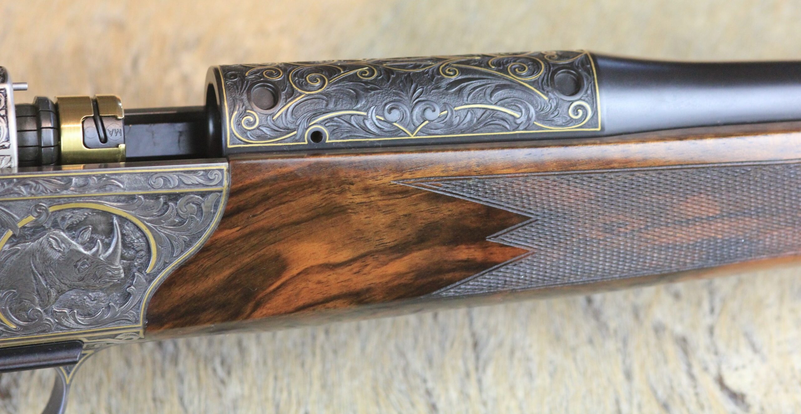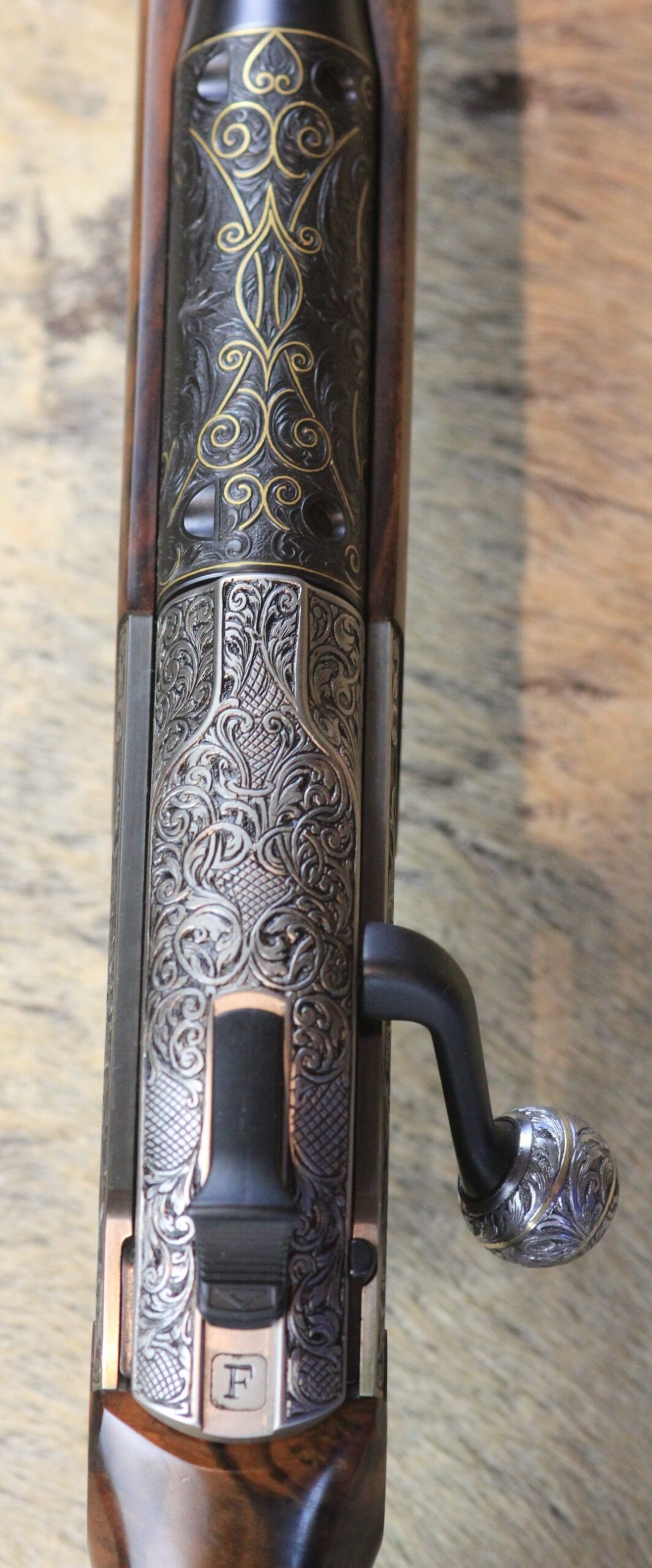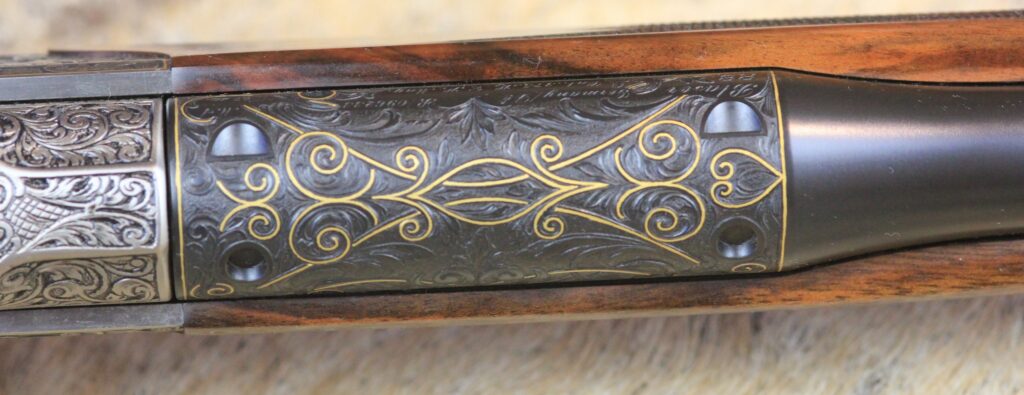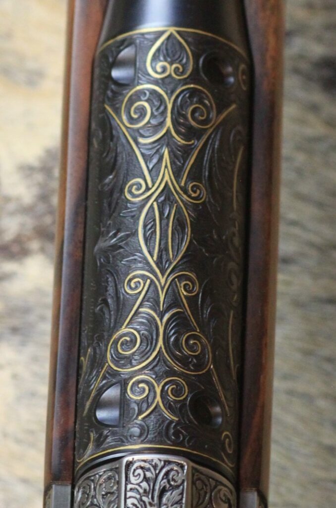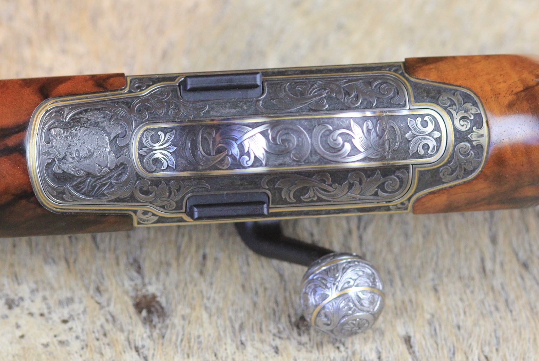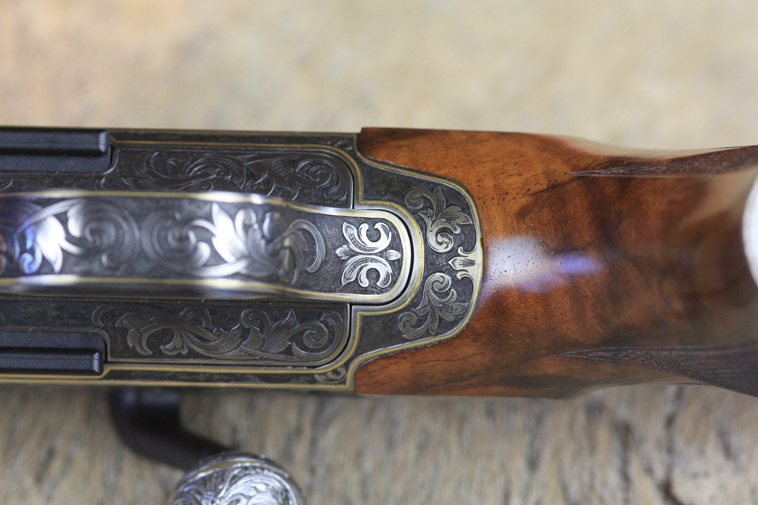 Besonderheiten: sensationelles türkisches Wurzelnussbaumholz der Kat: 10 mit tiefgestochener Gravur von Alexandra Feodorow “ BIG FIVE Gravur “ mit Goldeinlagen - Zubehör: PK Monogram mit eigener Gestaltung,Lederkoffer C orginal Blaser 2 Läufe & 2 Optiken
